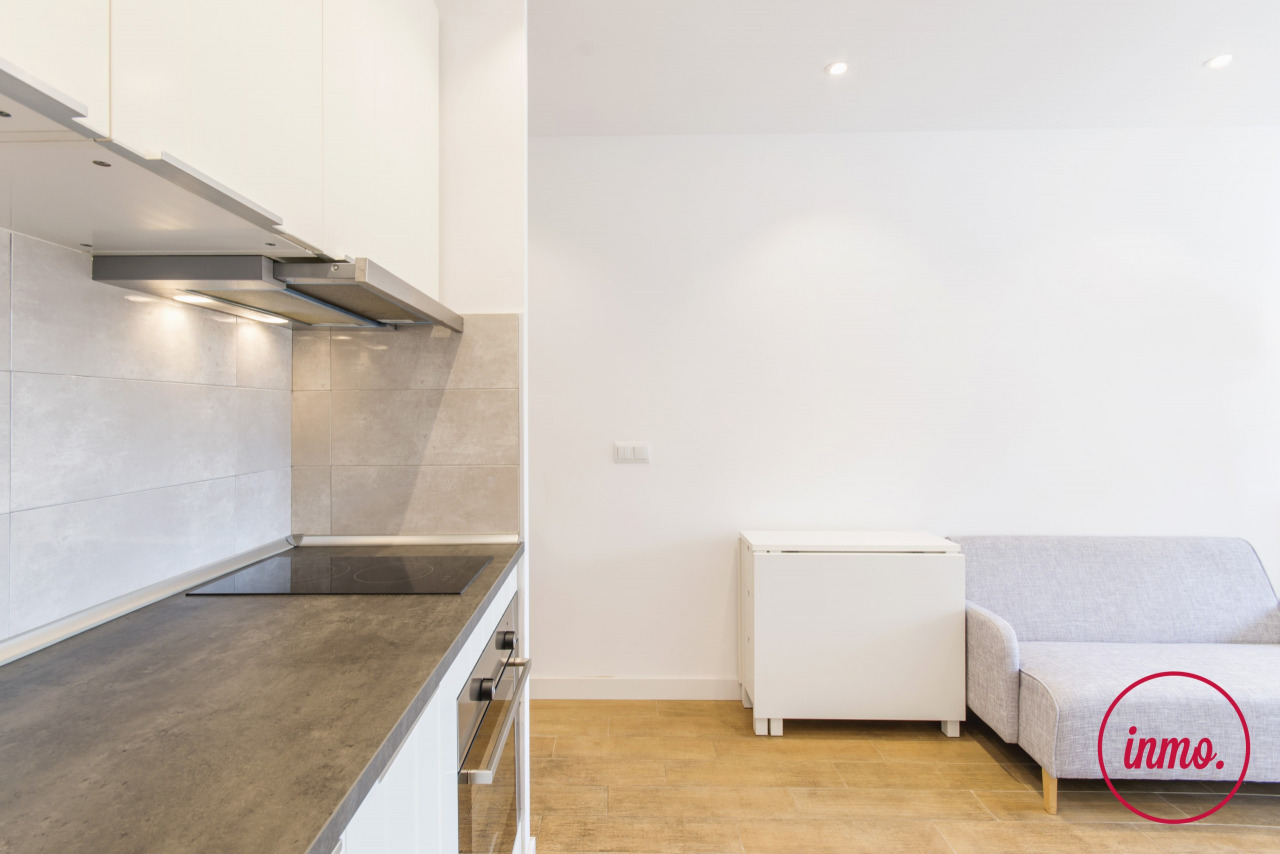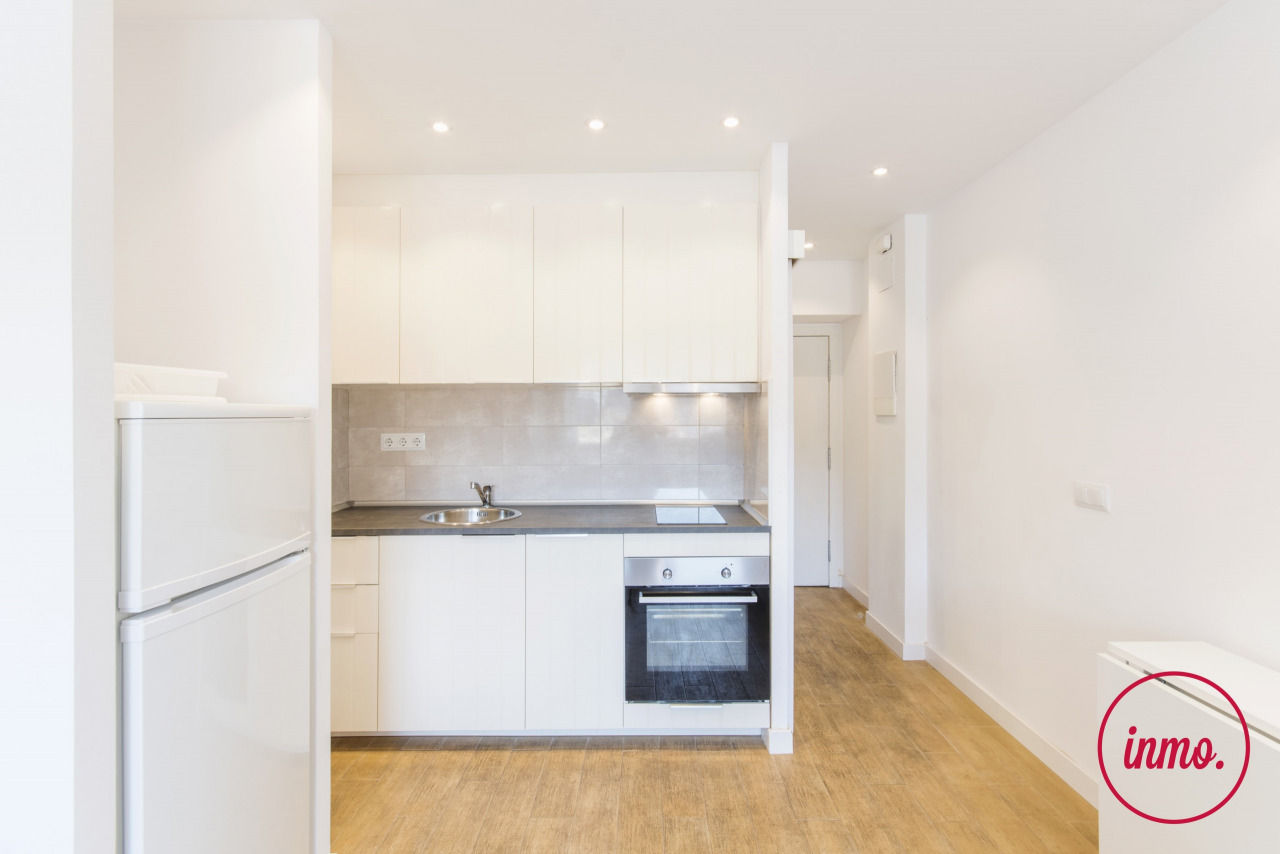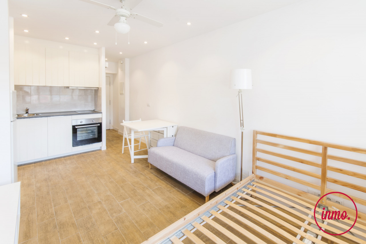 Estudio, con mucha luz y recién reformado con bonitos acabados, ubicado en la Avinguda del Paral. lel, en el barrio de Sant Antoni. El inmueble se distribuye en un único espacio rectangular que hace las veces de salón-comedor y dormitorio. La cocina, abierta al salón, está completamente equipada.